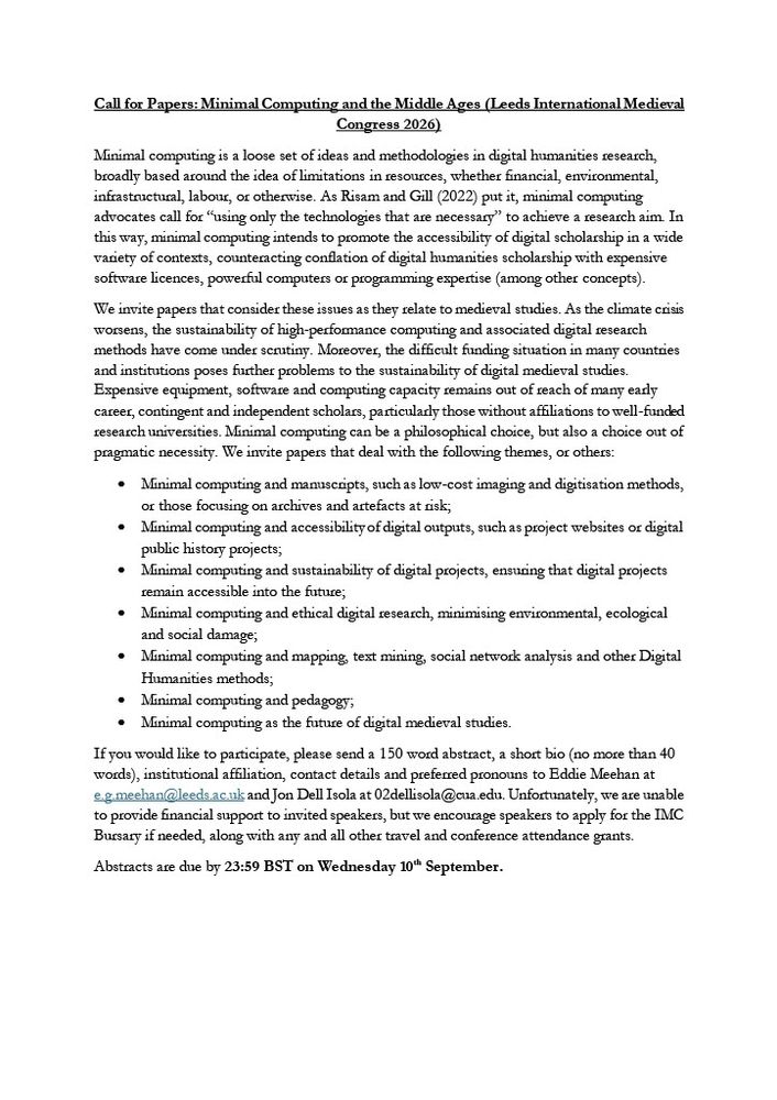 We invite papers that consider minimal computing issues as they relate to medieval studies. As the climate crisis worsens, the sustainability of high-performance computing and associated digital research methods have come under scrutiny. Moreover, the difficult funding situation in many countries and institutions poses further problems to the sustainability of digital medieval studies. Expensive equipment, software and computing capacity remains out of reach of many early career, contingent and independent scholars, particularly those without affiliations to well-funded research universities. Minimal computing can be a philosophical choice, but also a choice out of pragmatic necessity.