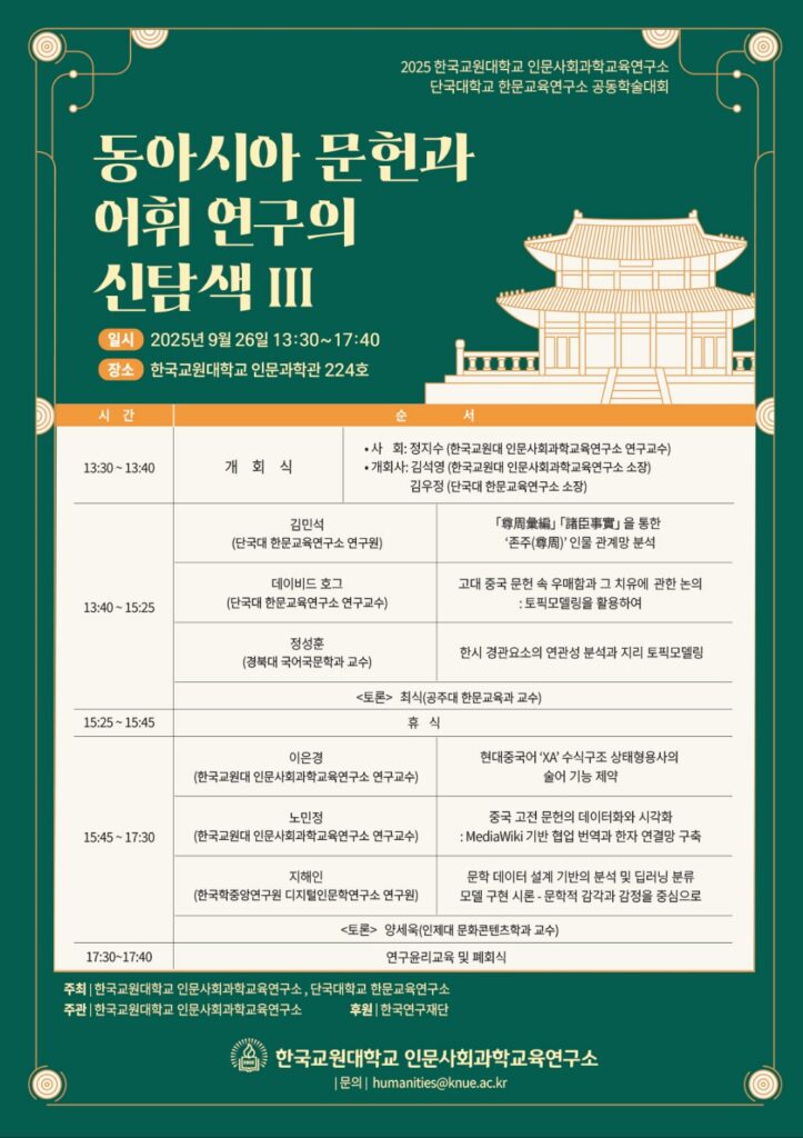 [AI Summary]: The Korea National University of Education’s Institute of Humanities and Social Sciences and Dankook University’s Institute of Classical Chinese Education are jointly hosting the “2025 Joint Academic Conference on New Explorations in East Asian Literature and Vocabulary Research III” on September 26, 2025. The conference will be held at the Korea National University of Education’s Humanities Building Room 224 from 1:30 PM to 5:40 PM. This academic conference, supported by the National Research Foundation of Korea, will feature multiple presentations and discussions exploring new approaches to studying East Asian literature and vocabulary.
