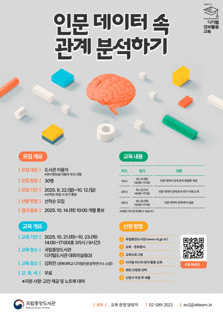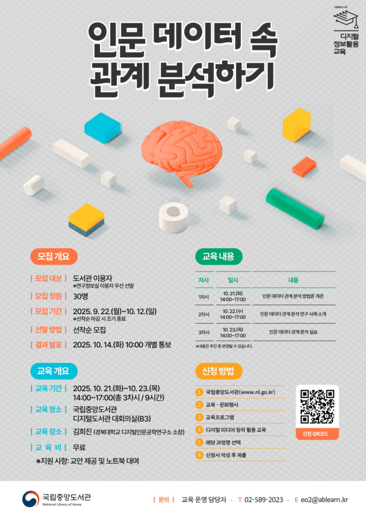 [AI Summary]: The National Library of Korea’s Research Information Office is offering a 3-day workshop on relationship analysis in humanities data from October 21-23, 2025 (2:00-5:00 PM daily). Led by Kim Hee-jin from Kyungpook National University’s Digital Humanities Engineering Research Institute, this practical training covers methodologies for analyzing relationships within humanities data, research case studies, and hands-on practice sessions. The free workshop targets library users and researchers looking to strengthen their data analysis capabilities, with priority given to Research Information Office users.